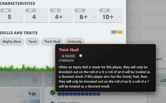 This extension adds rule tooltips for Blood Bowl 2025 skills and traits on TourPlay.net.
